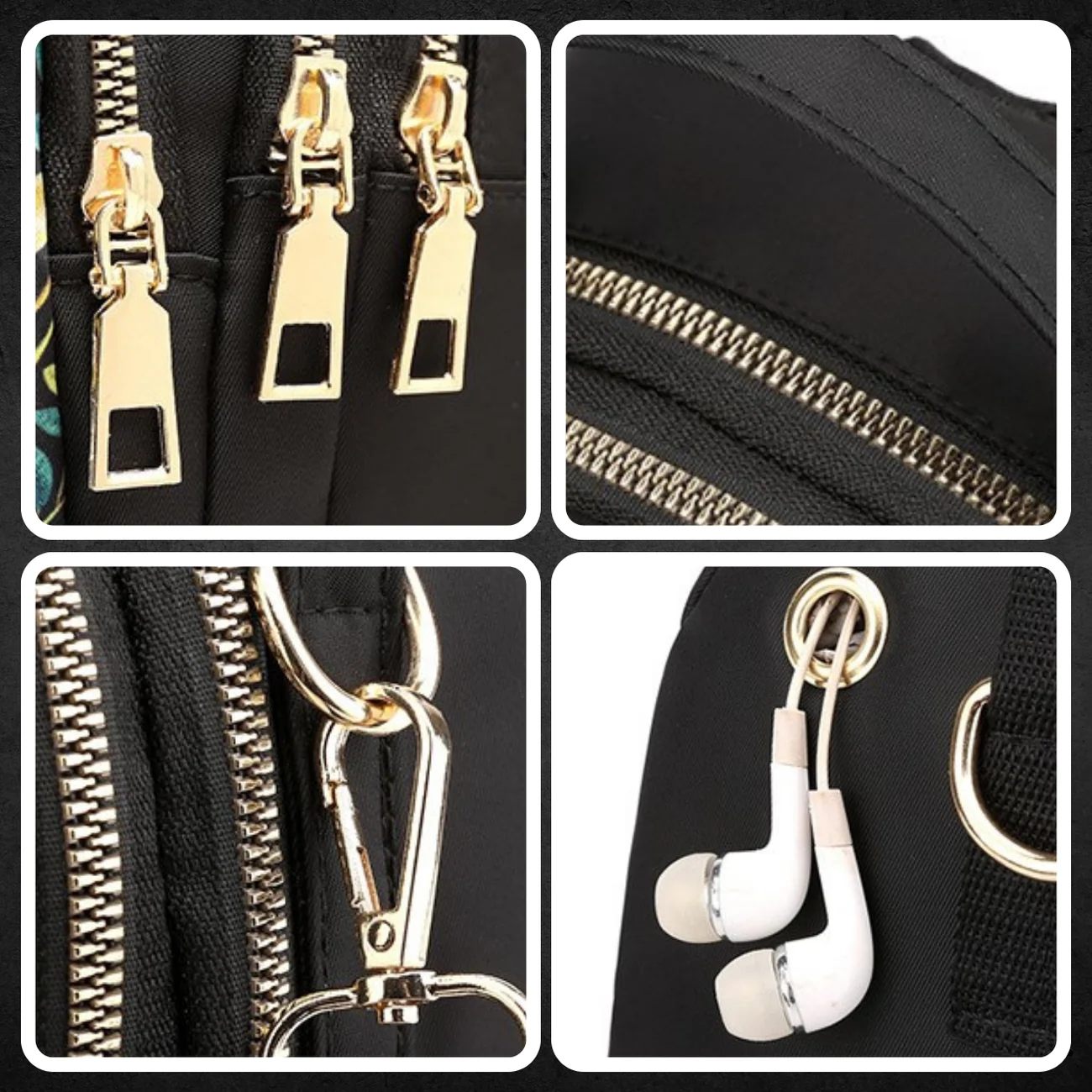 Wykonany z wysokiej jakości nylonu, plecak jest trwały i odporny na codzienne zużycie. Czarny kolor z kolorowymi wzorami nadaje mu wyjątkowego charakteru, a złote okucia dodają elegancji i klasy, podkreślając nowoczesny design.