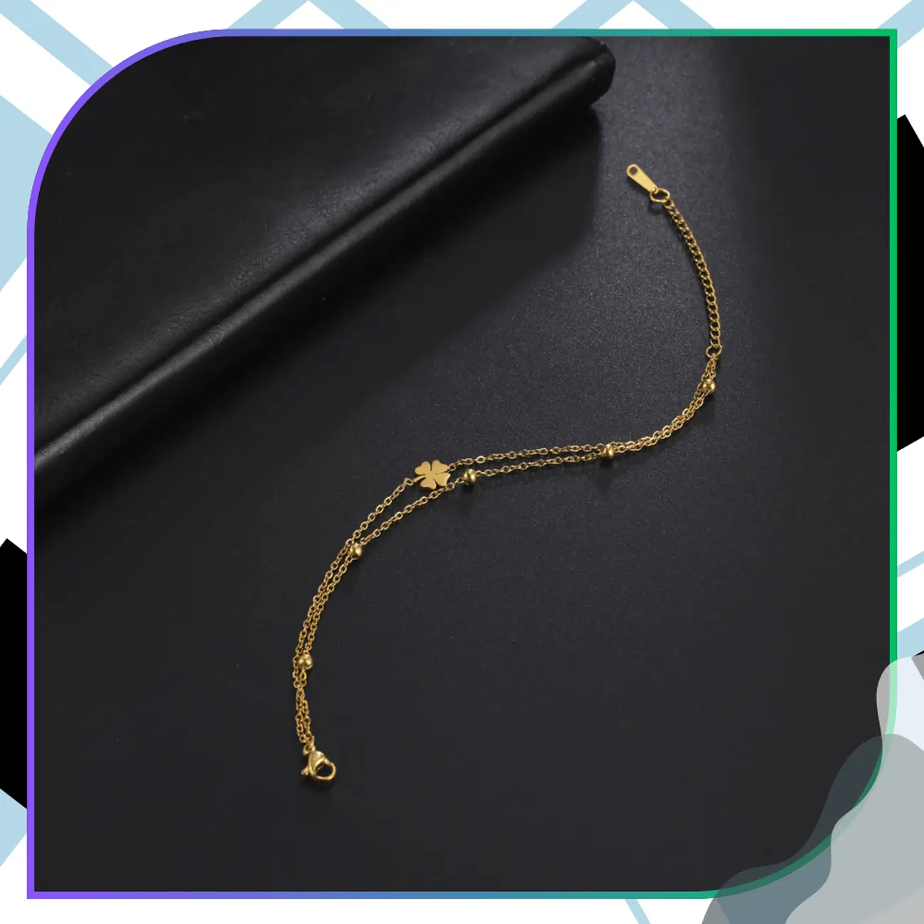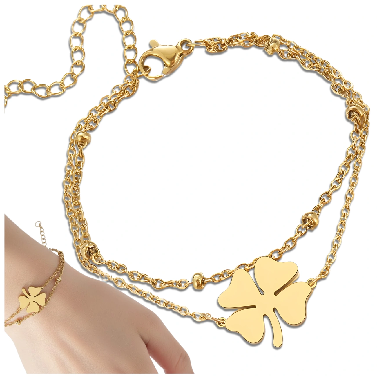 Proponowana przez nas bransoletka łańcuszek koniczynka złota stal chirurgiczna elegancka składa się z dwóch łańcuszków o długości 15 cm każdy. Pierwszy z łańcuszków to klasyczny ankier z nawleczonymi, małymi kuleczkami, umieszczonymi w równych odstępach. Drugi łańcuszek to również delikatny ankier, ale z umieszczoną pośrodku niedużą, błyszczącą pięknie w słonecznym i sztucznym świetle, koniczynką czterolistną z krótką łodyżką.