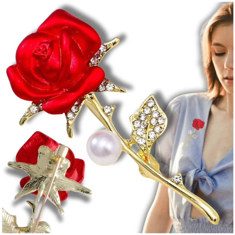 Centralnym elementem broszki jest elegancka czerwona róża, symbolizująca miłość i pasję. Otoczona cyrkoniami, które odbijają światło w subtelny sposób, broszka przyciąga wzrok i dodaje blasku każdemu strojowi. Delikatna perełka u dołu róży podkreśla jej wyrafinowany charakter, tworząc harmonijną kompozycję, która z pewnością zachwyci.