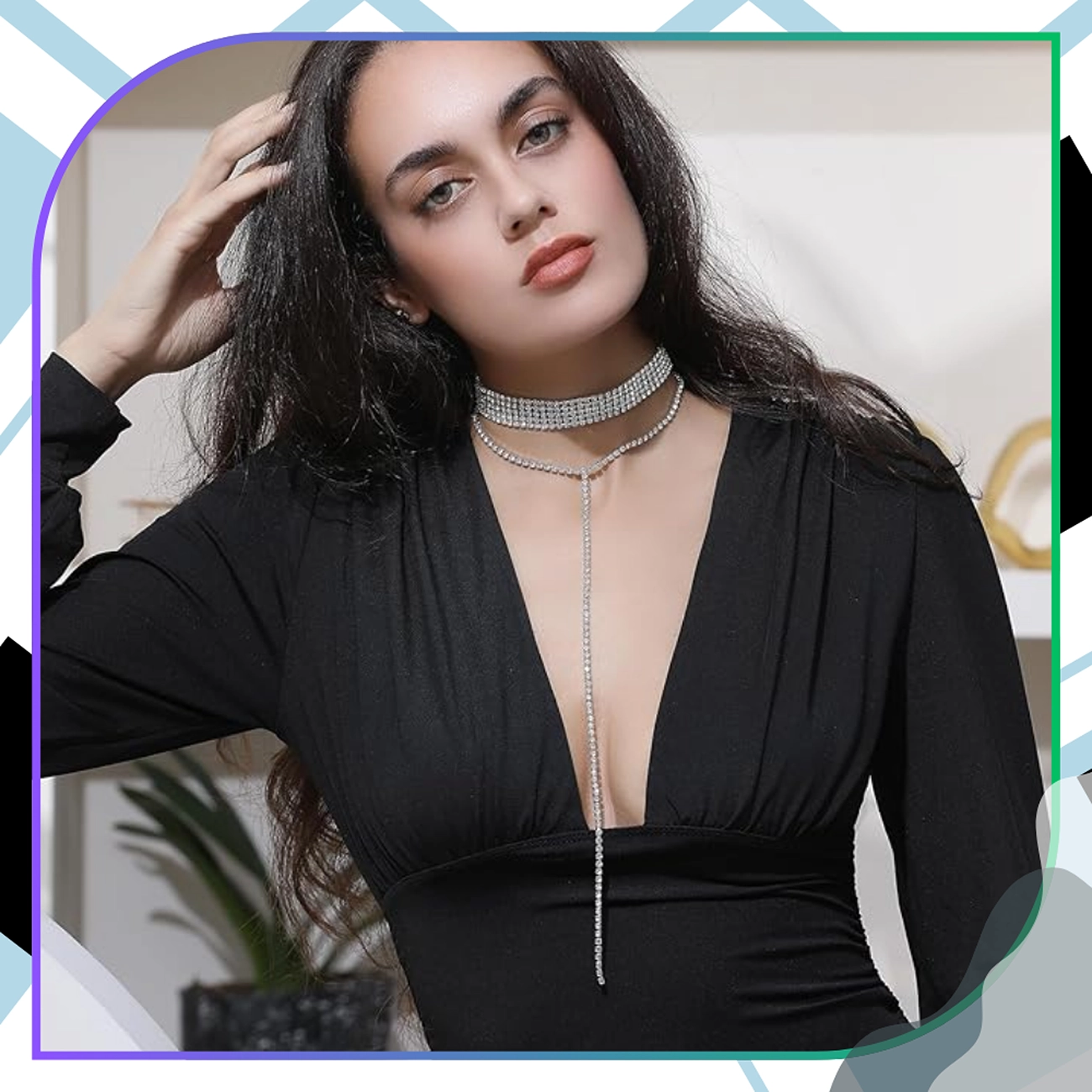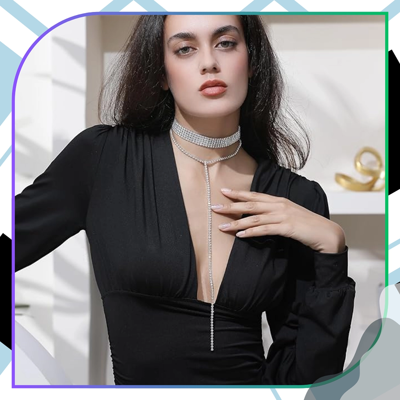 Cyrkonie przytwierdzone na przezroczystej taśmie tworzą świetny efekt na szyi