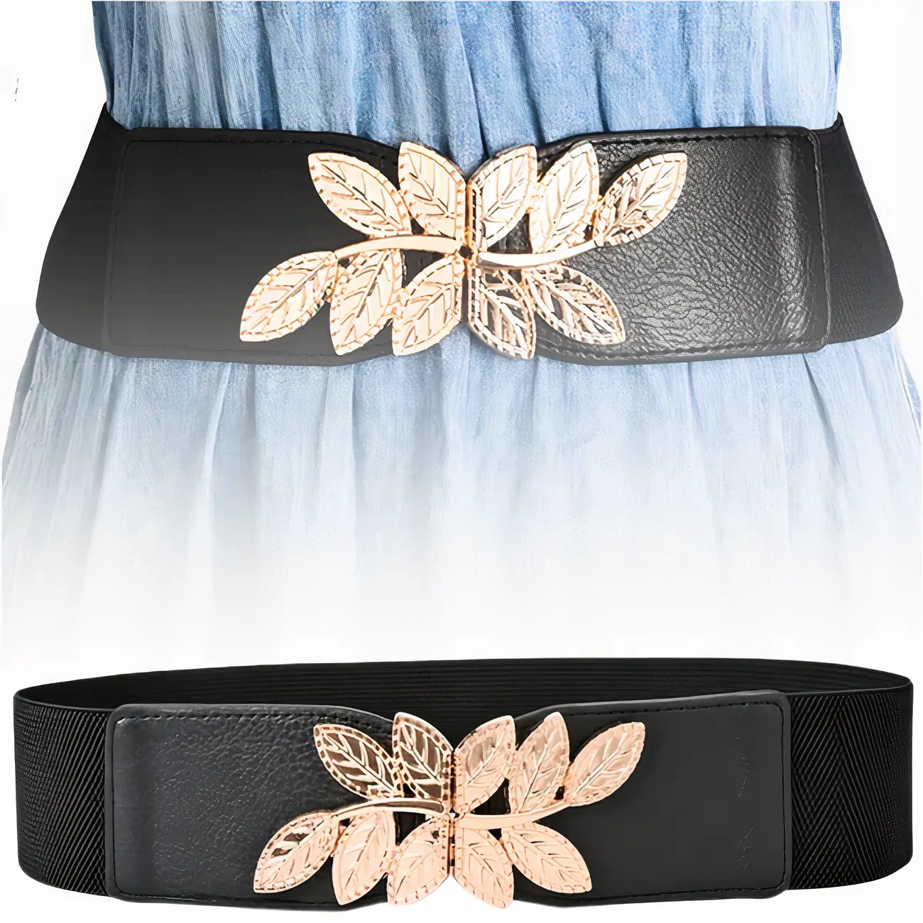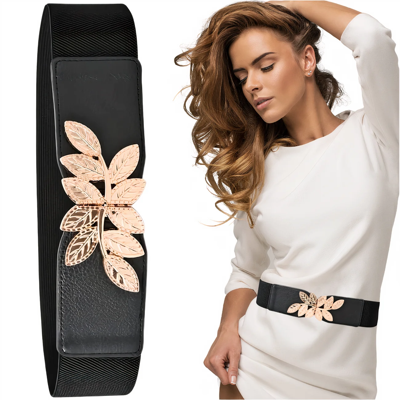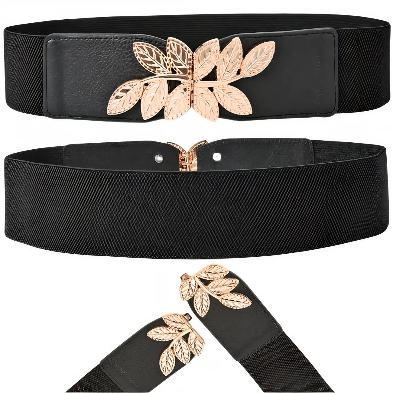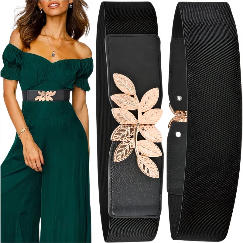 Elastyczny Pasek Damski z Ozdobną Klamrą Listki, Złoty Akcent