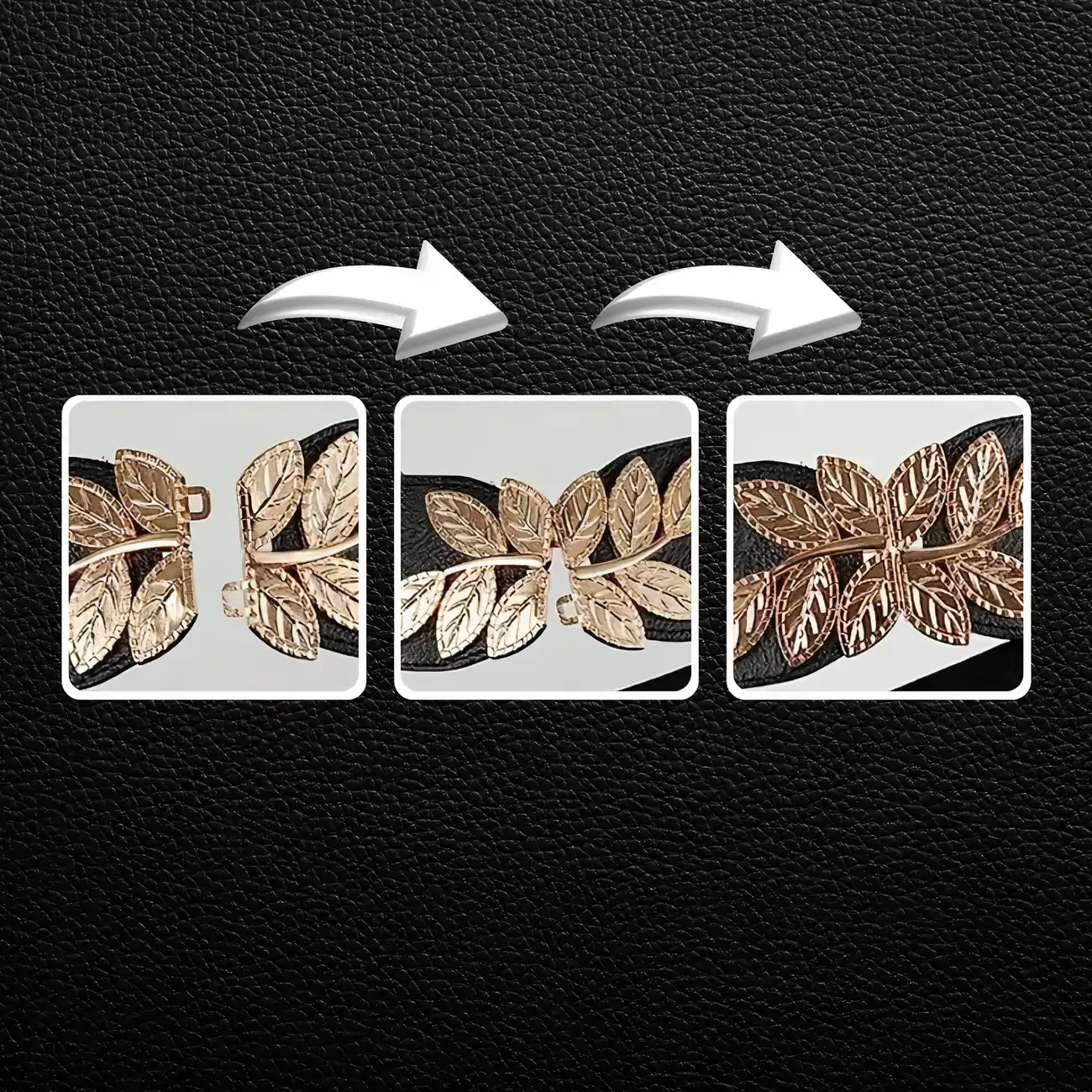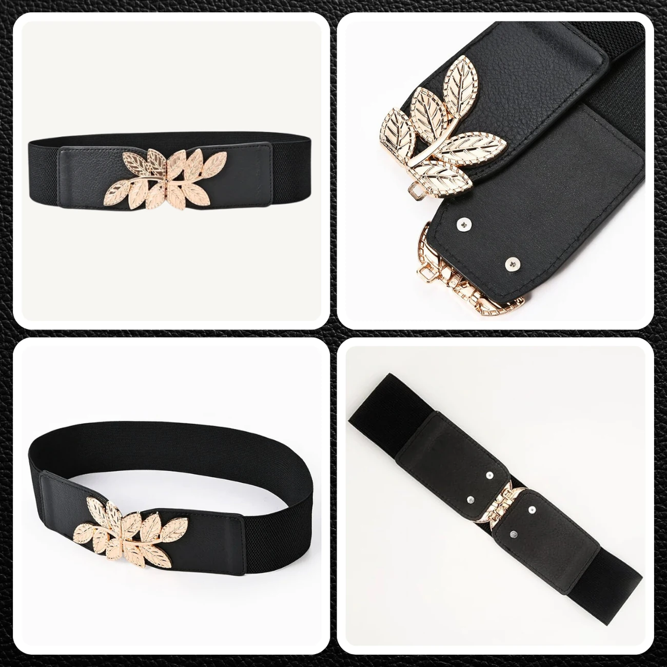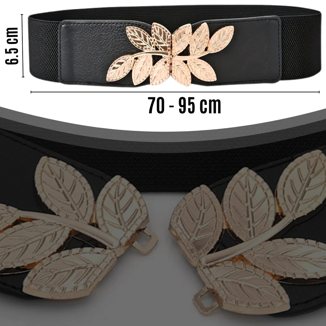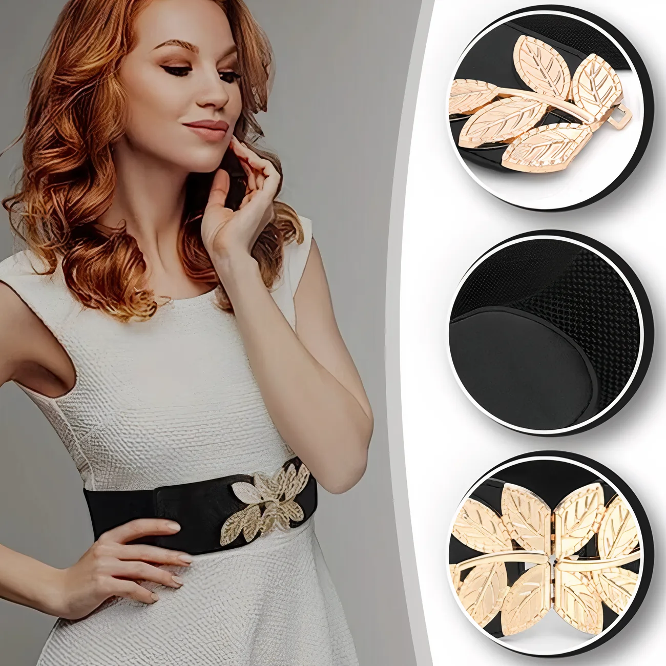 Elastyczny Pasek Damski z Ozdobną Klamrą Listki, Złoty Akcent