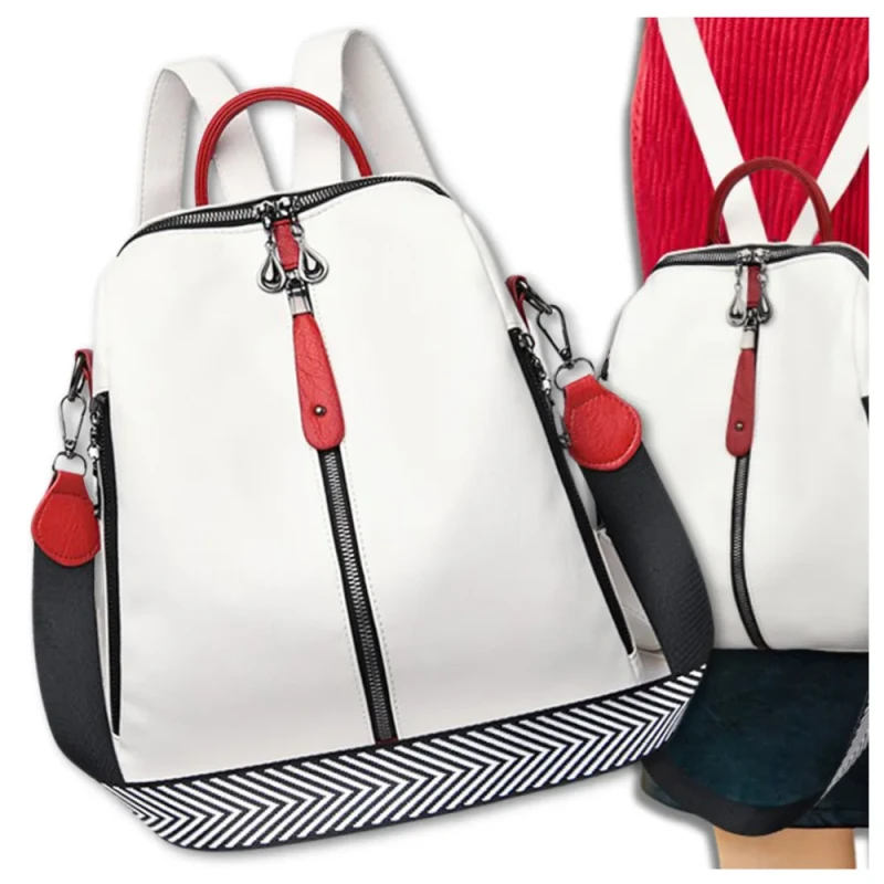 Plecak damski biały skórzany duży retro ma białe, wygodne, regulowane szelki, a w górnej części wytrzymały uchwyt czerwonej barwy. Dodatkowo do produktu dołączony jest materiałowy pasek do noszenia na ramieniu, wykończony czerwoną ekoskórą. Zdobi go biało-czarny, jodełkowy wzór. Przypinany jest do plecaka za pomocą metalowych karabińczyków w czarnym kolorze.