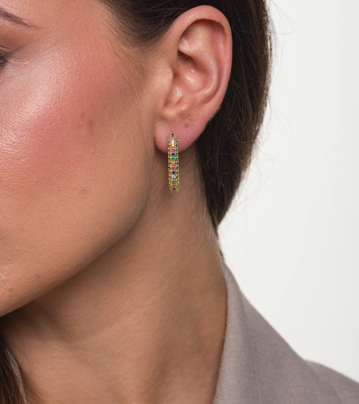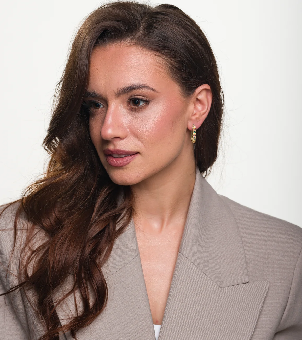 Eleganckie kolczyki złote pozłacane - prostokątne z kolorowymi cyrkoniami