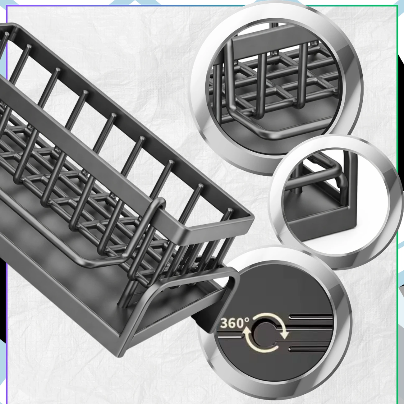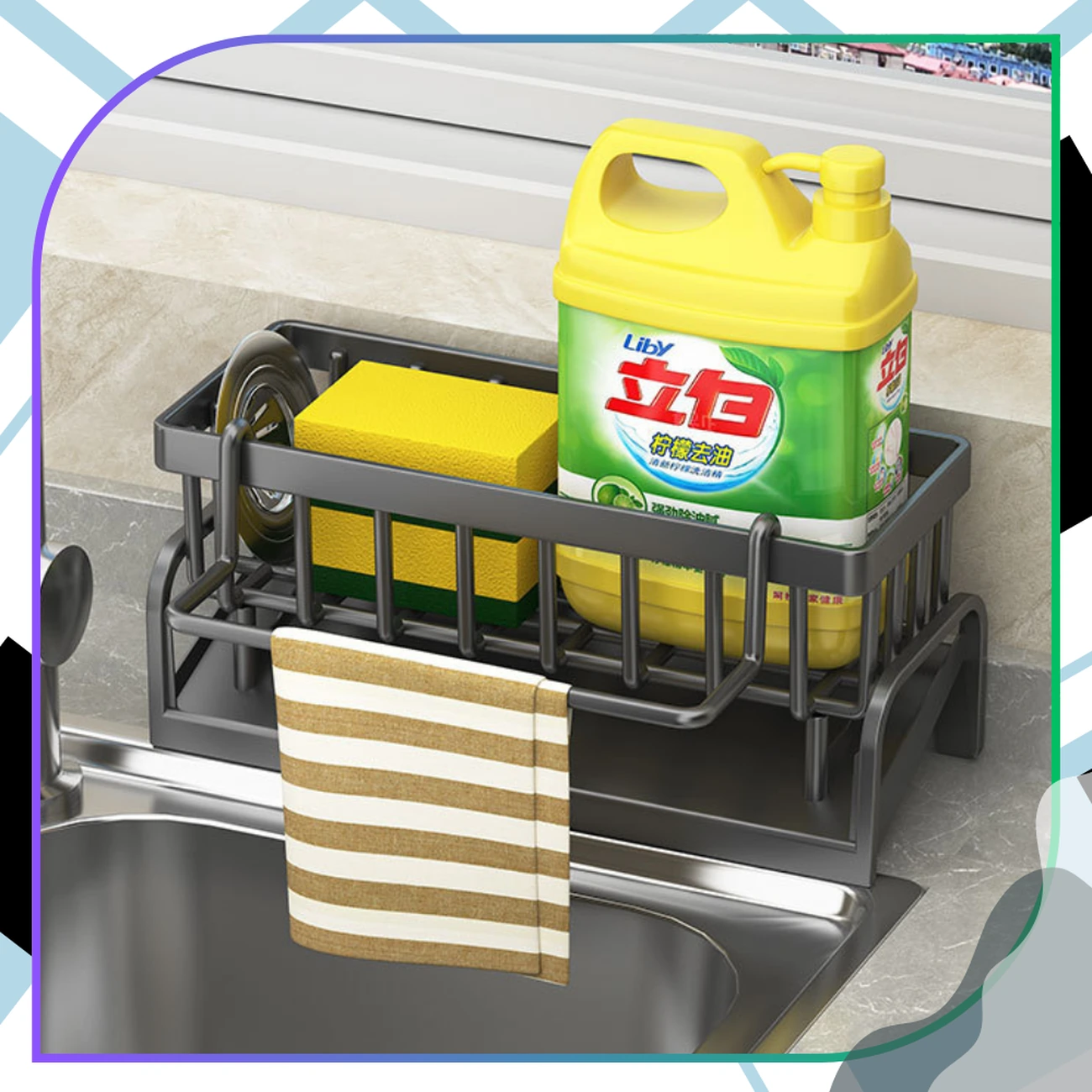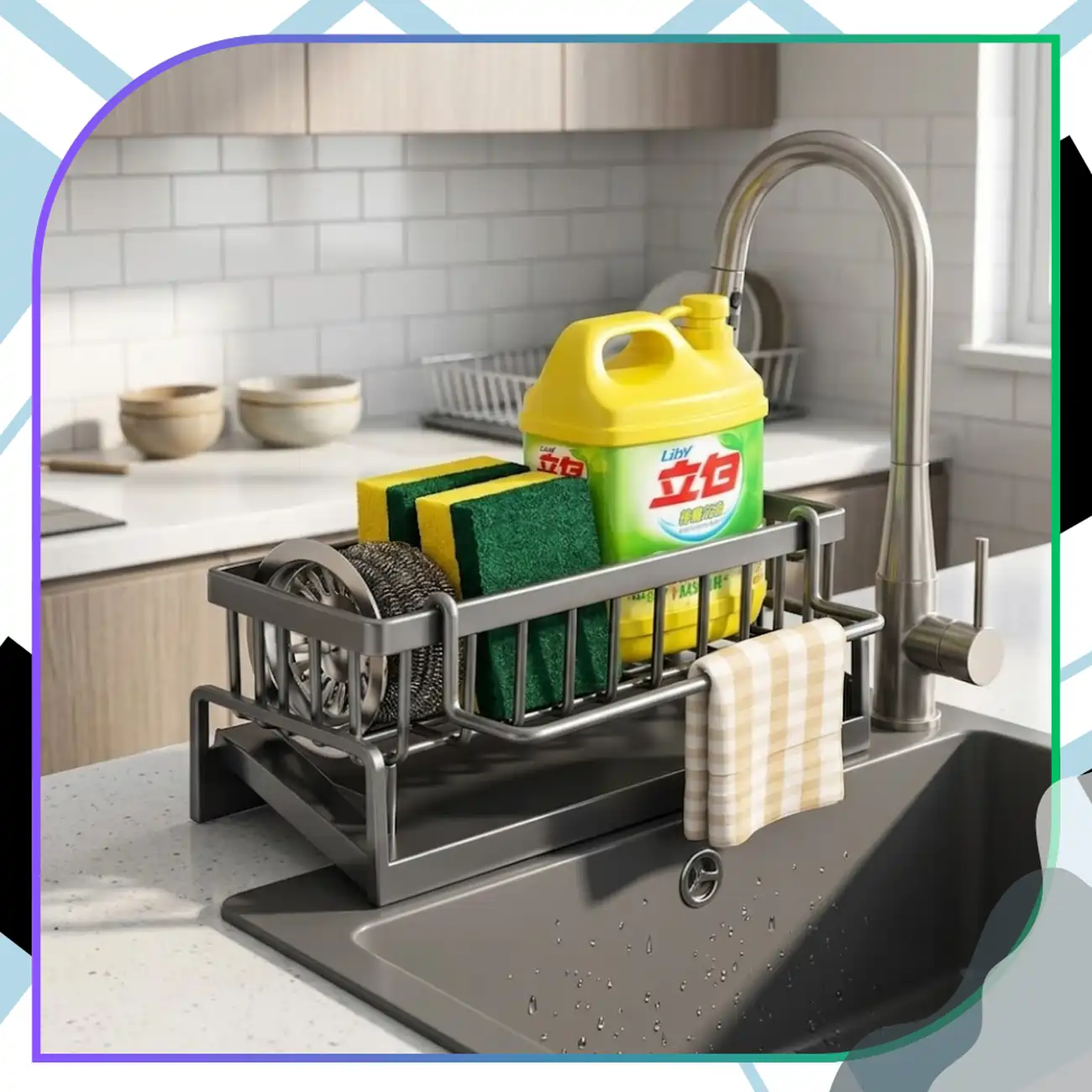 Wbudowany drążek sprawia, że stojak do zlewu świetnie sprawdza się również jako miejsce na ściereczkę lub ręcznik kuchenny. To rozwiązanie pozwala zaoszczędzić miejsce i utrzymać porządek na blacie.