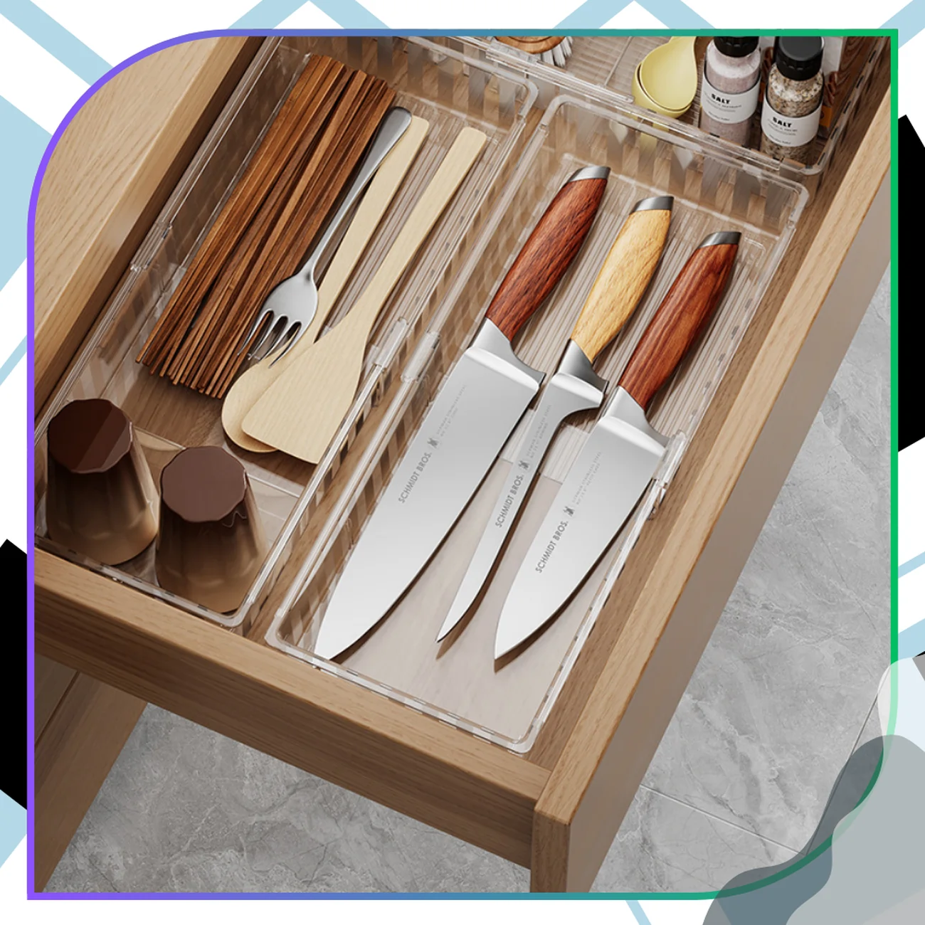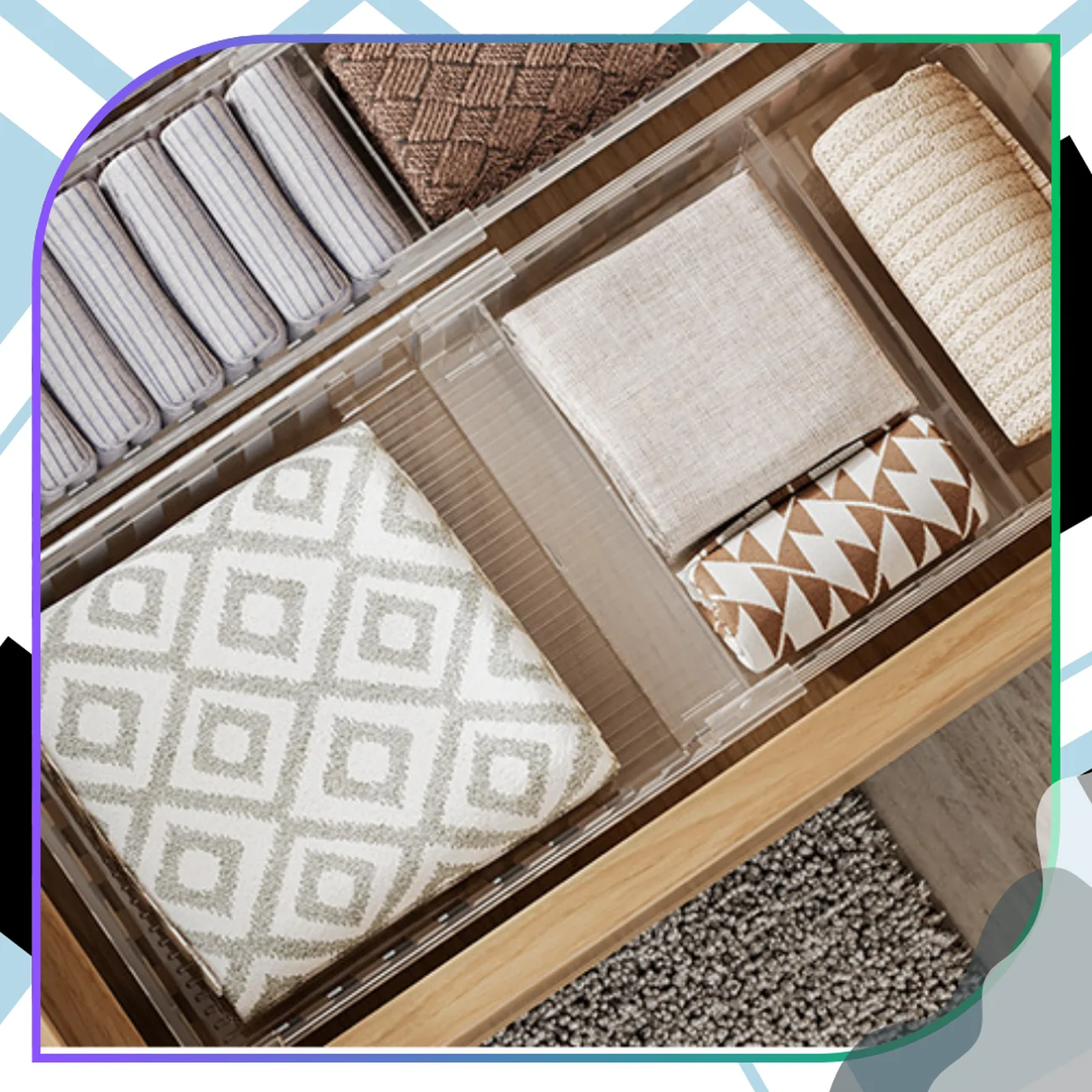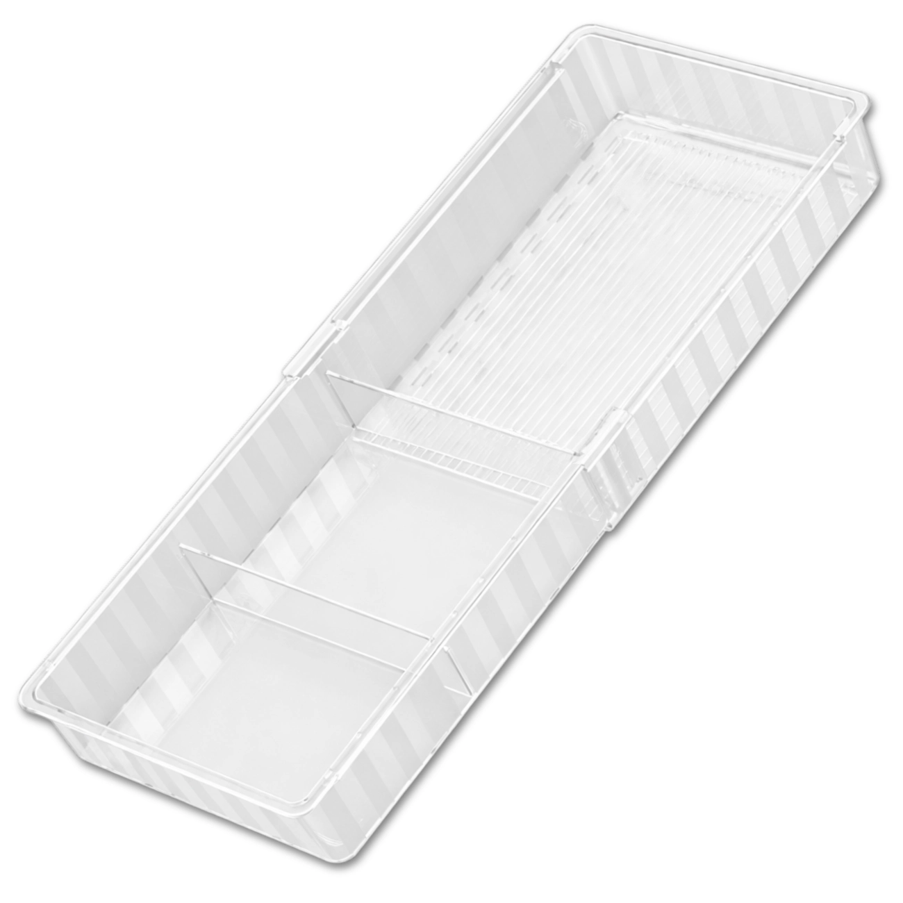 Dzięki funkcji regulacji organizer pełni także rolę separatora, który stabilizuje zawartość szuflady. Jego transparentny wygląd sprawia, że pasuje do każdego wnętrza, dodając mu lekkości i nowoczesnego charakteru.