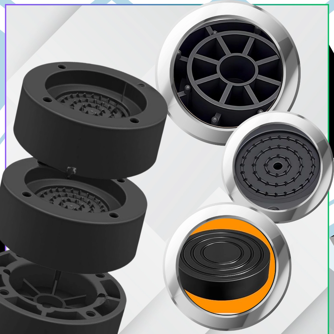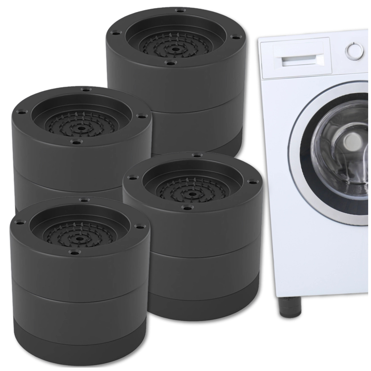 Podkładki zostały zaprojektowane w taki sposób, aby skutecznie tłumić drgania oraz redukować hałas generowany przez pracującą pralkę, suszarkę czy lodówkę. Dzięki antypoślizgowemu wykończeniu, podkładki pod pralkę zapobiegają przesuwaniu się urządzeń, co chroni podłogę przed zarysowaniami i innymi uszkodzeniami.