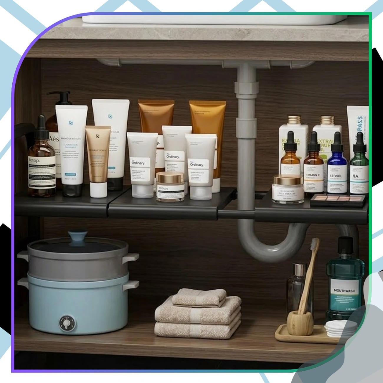 Organizer może być używany nie tylko w kuchni. Doskonale sprawdzi się także w łazience, gdzie pomoże uporządkować kosmetyki i środki czystości, a także w innych pomieszczeniach wymagających lepszej organizacji przestrzeni.