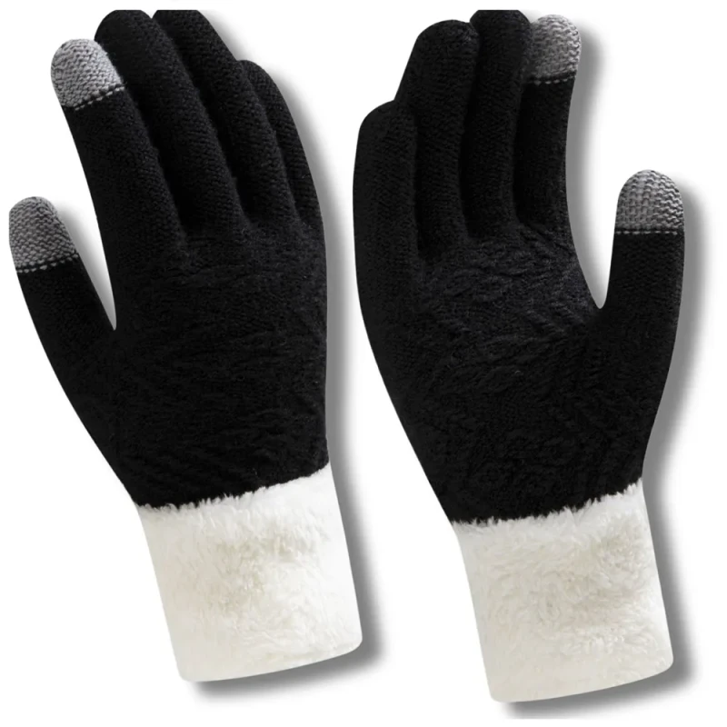 Pięciopalczaste, starannie wykonane, zimowe z misiem czarne rękawiczki damskie mają specjalną powłokę na kciuku i palcu wskazującym, w szarym kolorze. Umożliwia ona obsługę ekranu dotykowego telefonu lub tabletu, bez potrzeby ich ściągania.