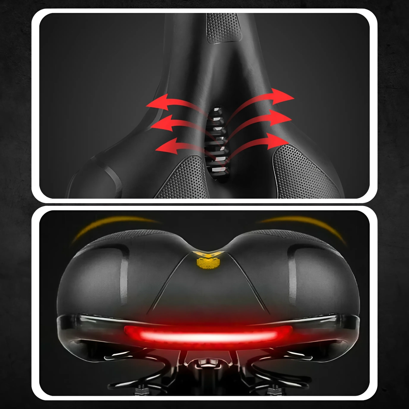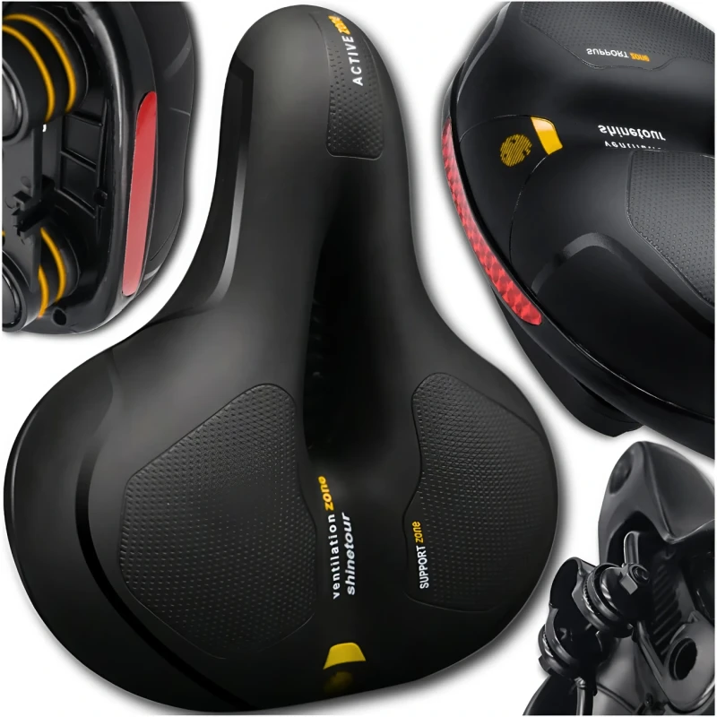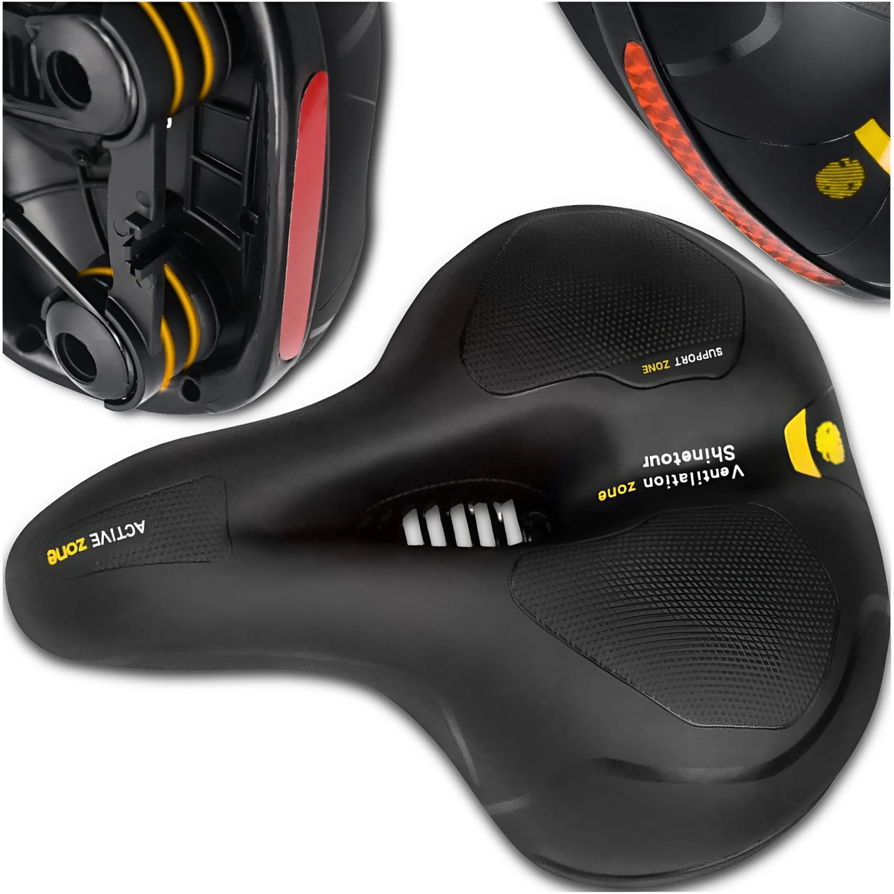 Siodełko jest uniwersalne i pasuje do wielu rodzajów rowerów, w tym szosowych, MTB oraz górskich. Odblaskowa taśma umieszczona na tylnej części siodełka zapewnia dodatkowe bezpieczeństwo, zwiększając widoczność rowerzysty podczas jazdy po zmroku. Dzięki środkowej wentylacji, poduszka siodełka gwarantuje odpowiednią cyrkulację powietrza, co dodatkowo podnosi komfort użytkowania.