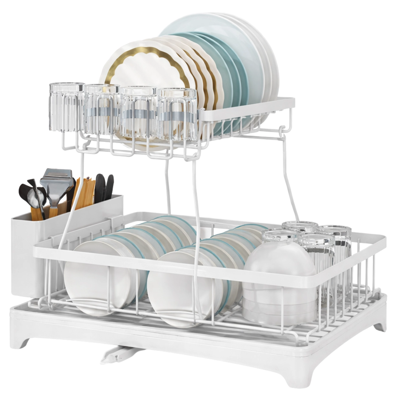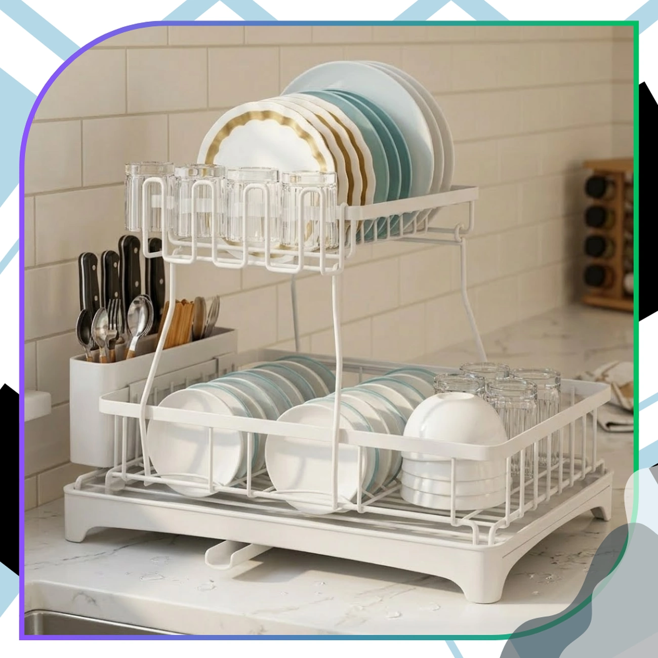 Dwupoziomowy układ zapewnia optymalne wykorzystanie przestrzeni – górna półka doskonale sprawdzi się na talerze, natomiast dolna pomieści miski, kubki i inne akcesoria. Dodatkowe uchwyty umożliwiają zawieszenie kubków oraz przechowywanie sztućców.