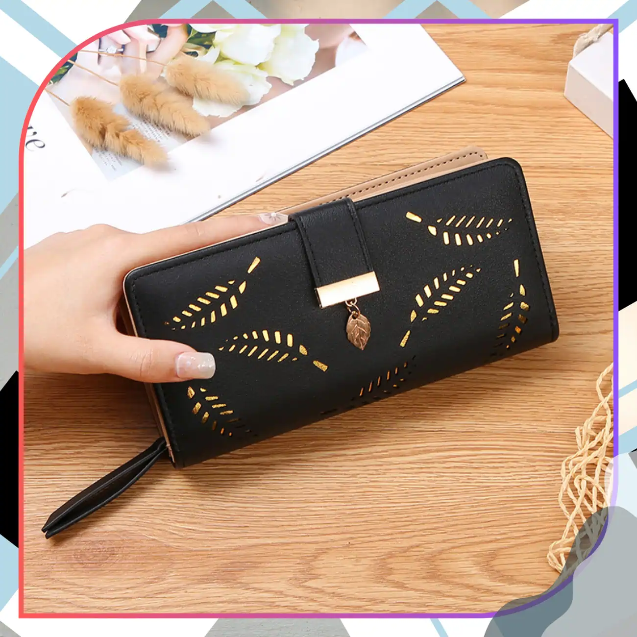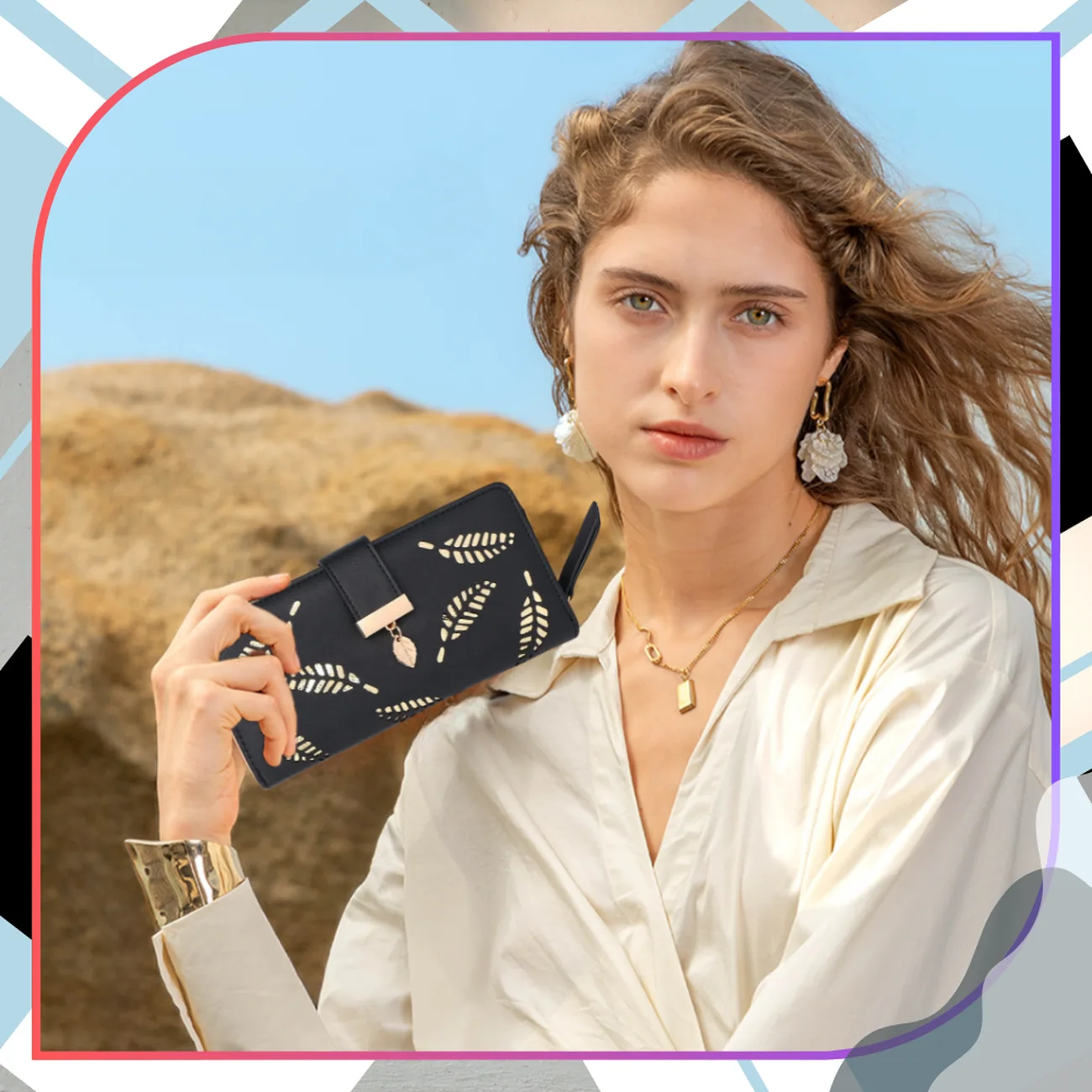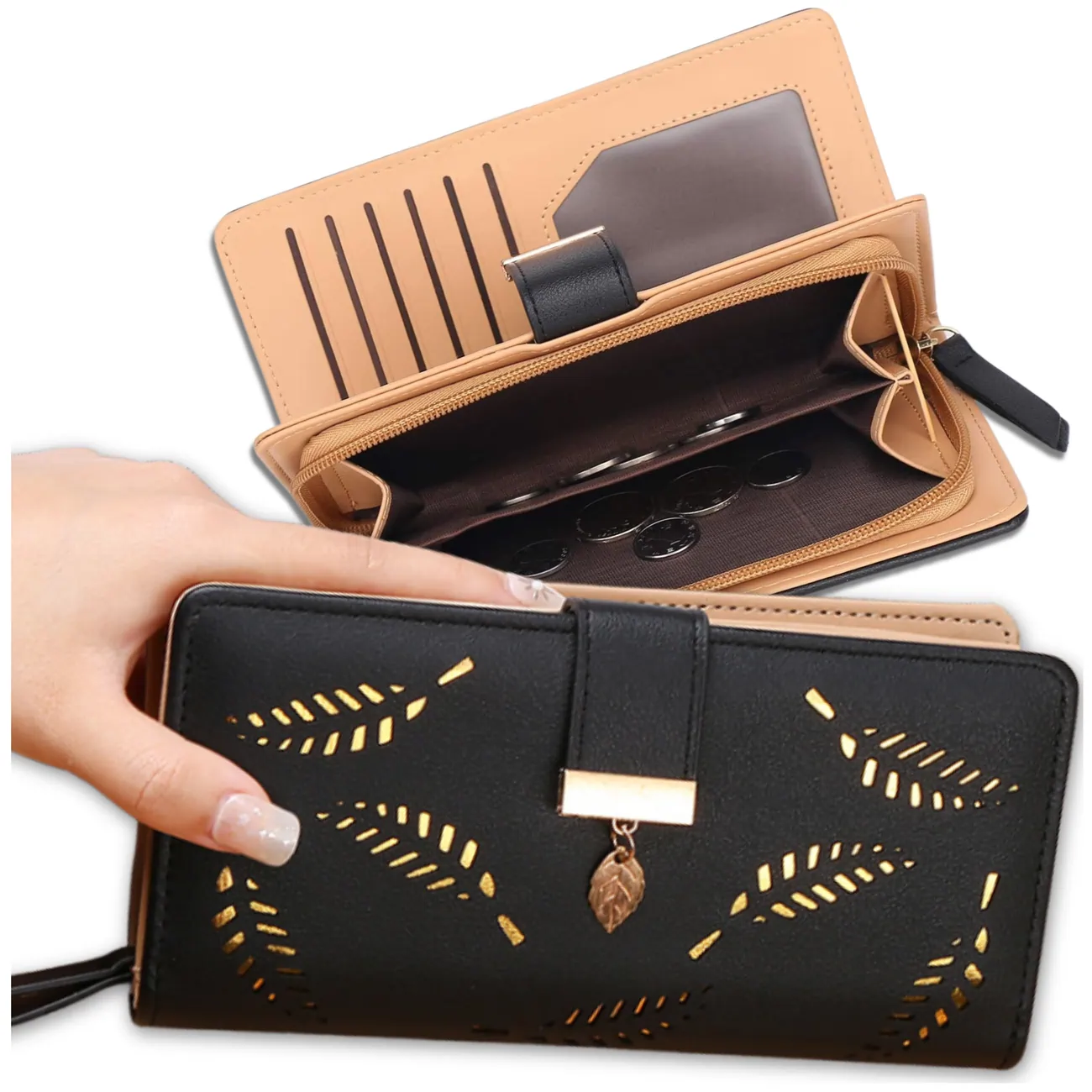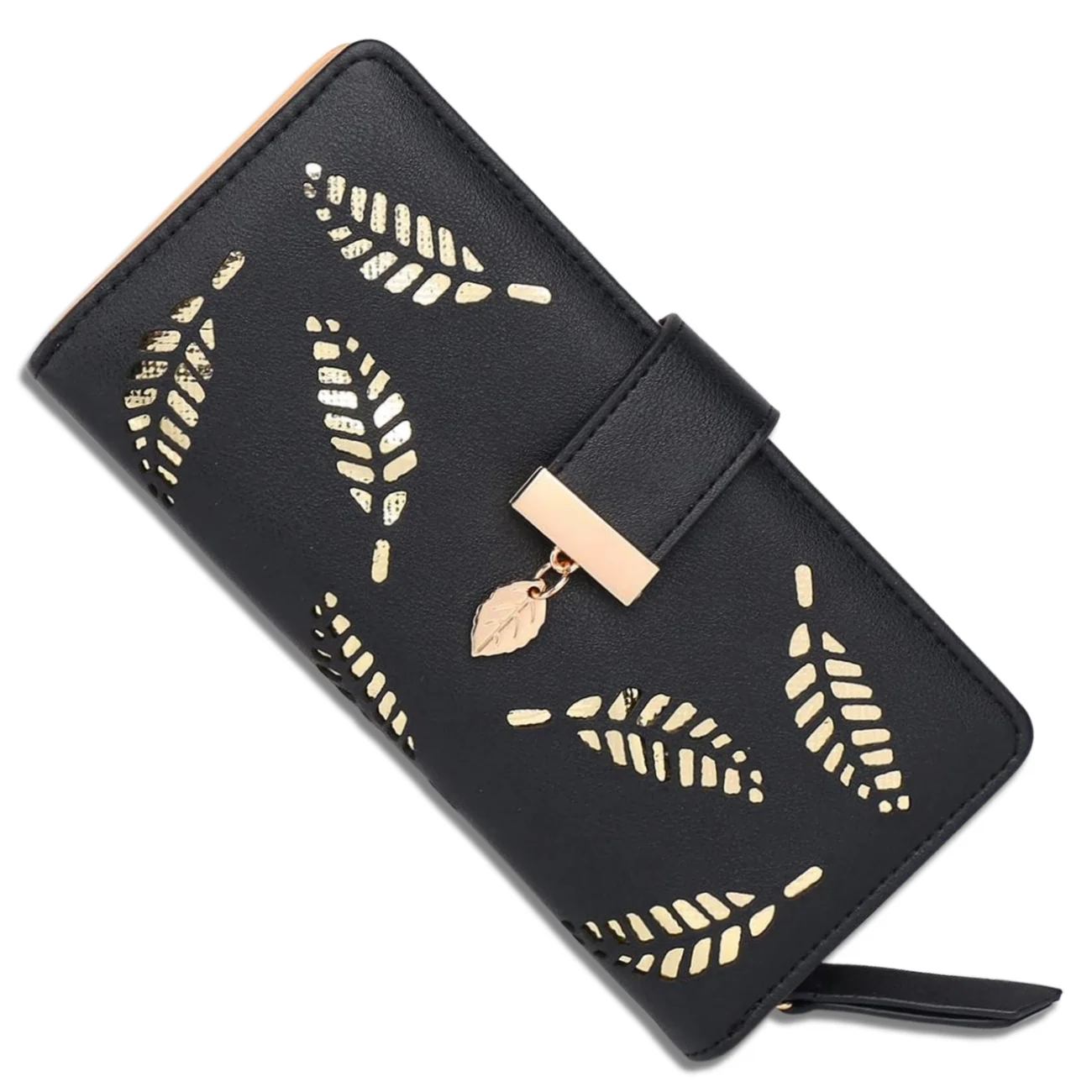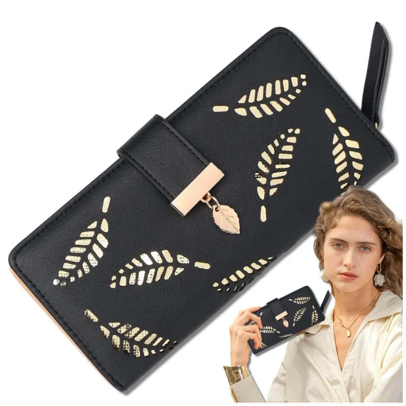 Poznaj wyjątkowy czarno-złoty portfel damski, który łączy szyk, elegancję i funkcjonalność w jednym stylowym dodatku! Wykonany z wysokiej jakości skóry ekologicznej, ten portfel wyróżnia się unikalnym designem z wycięciami odsłaniającymi subtelne, złote listki. To doskonały wybór dla kobiet, które cenią sobie luksusowy wygląd i praktyczność w codziennym użytkowaniu.